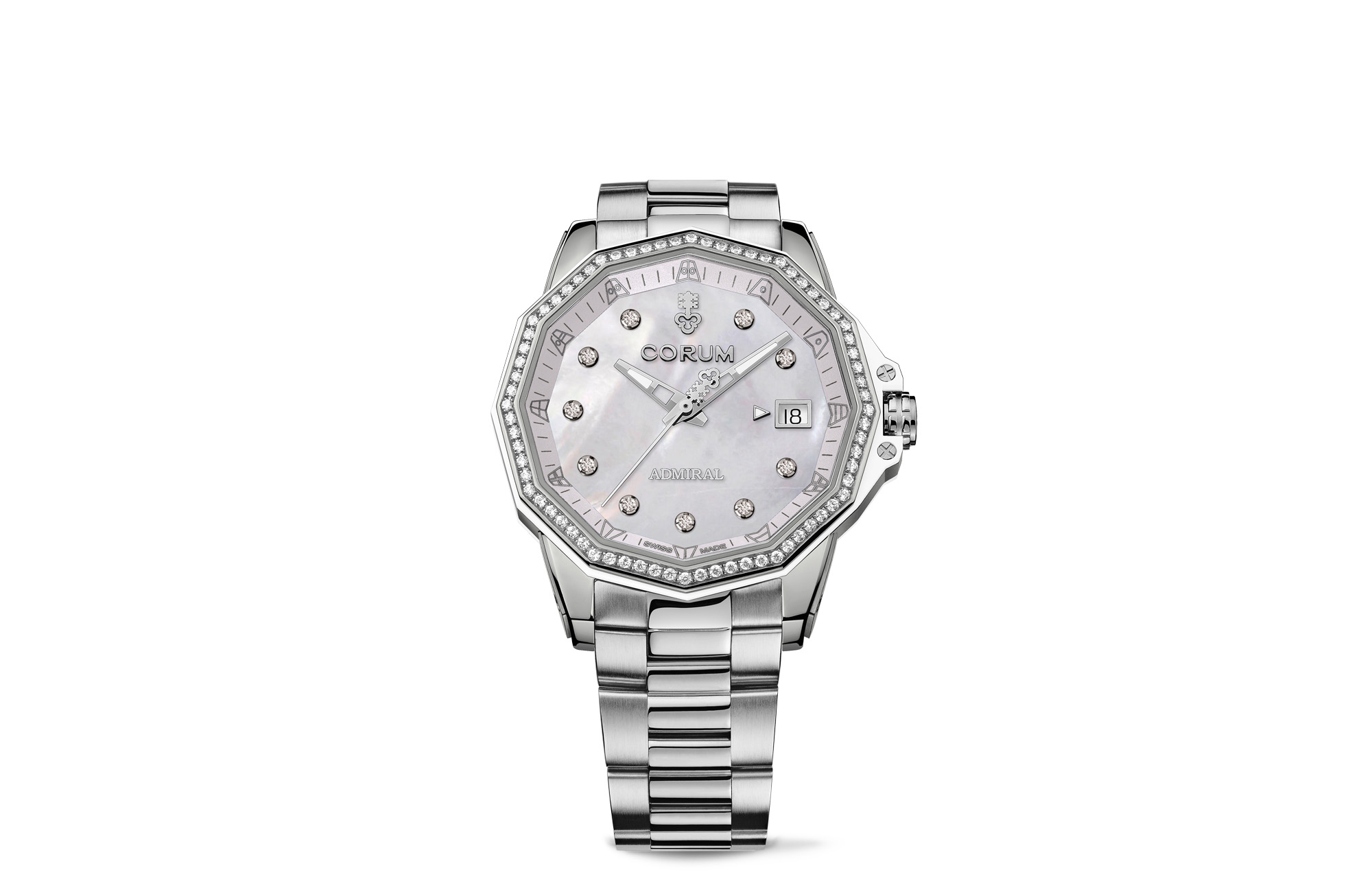 This Admiral 38 contemporary line embraces the design identity of the iconic Admiral collection born 60 years ago with its instantly recognizable 12-sided case and nautical pennants on the dial.